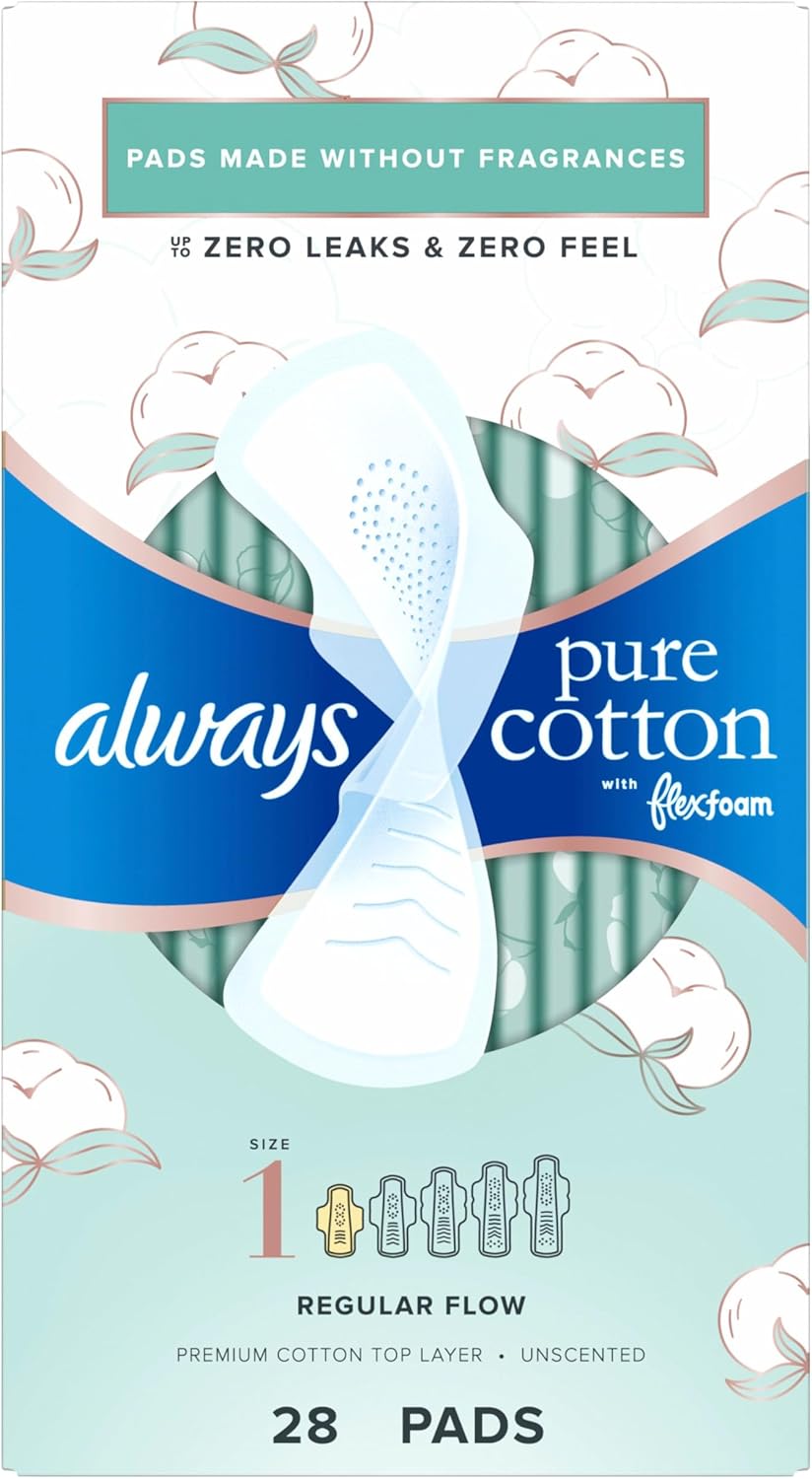 Always Pure Cotton Feminine Pads for Women, FlexFoam Pads with Wings, Size 1, Regular Absorbency, Unscented, 84 Count (3 Packs of 28)