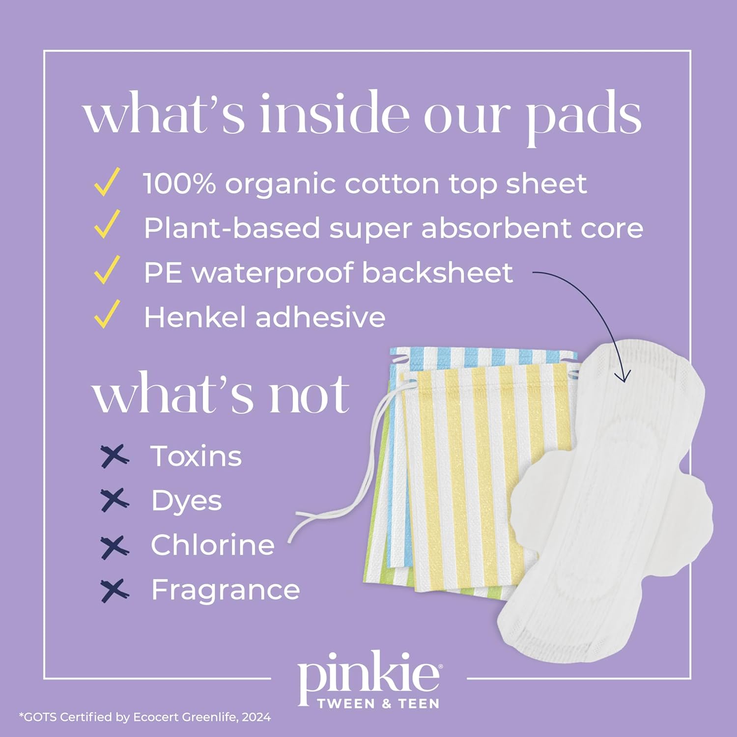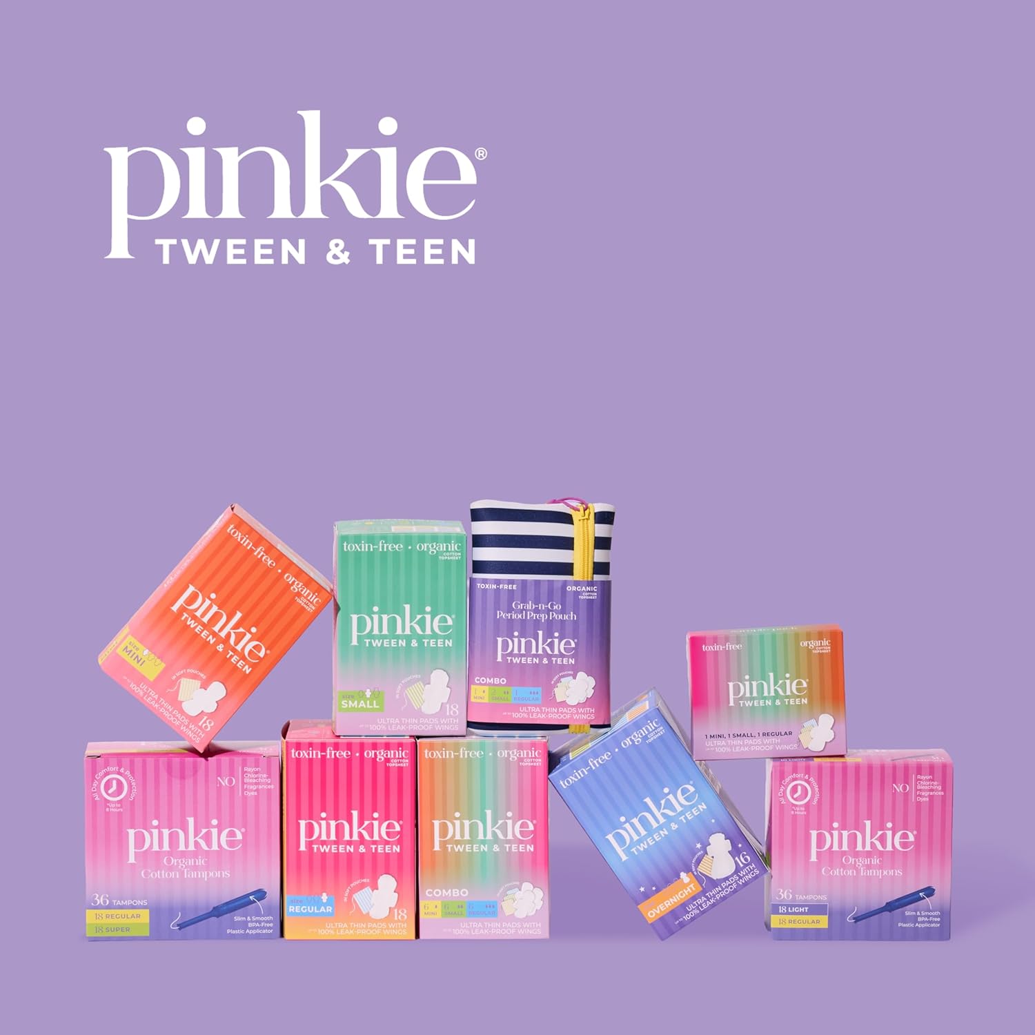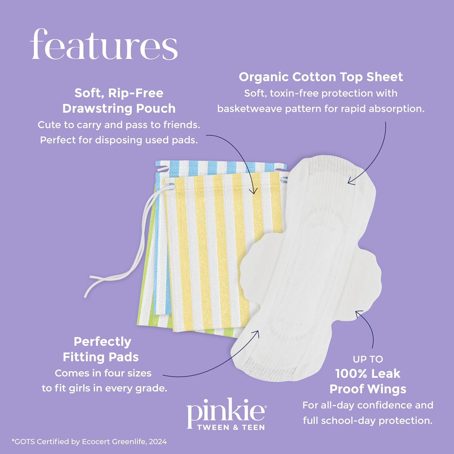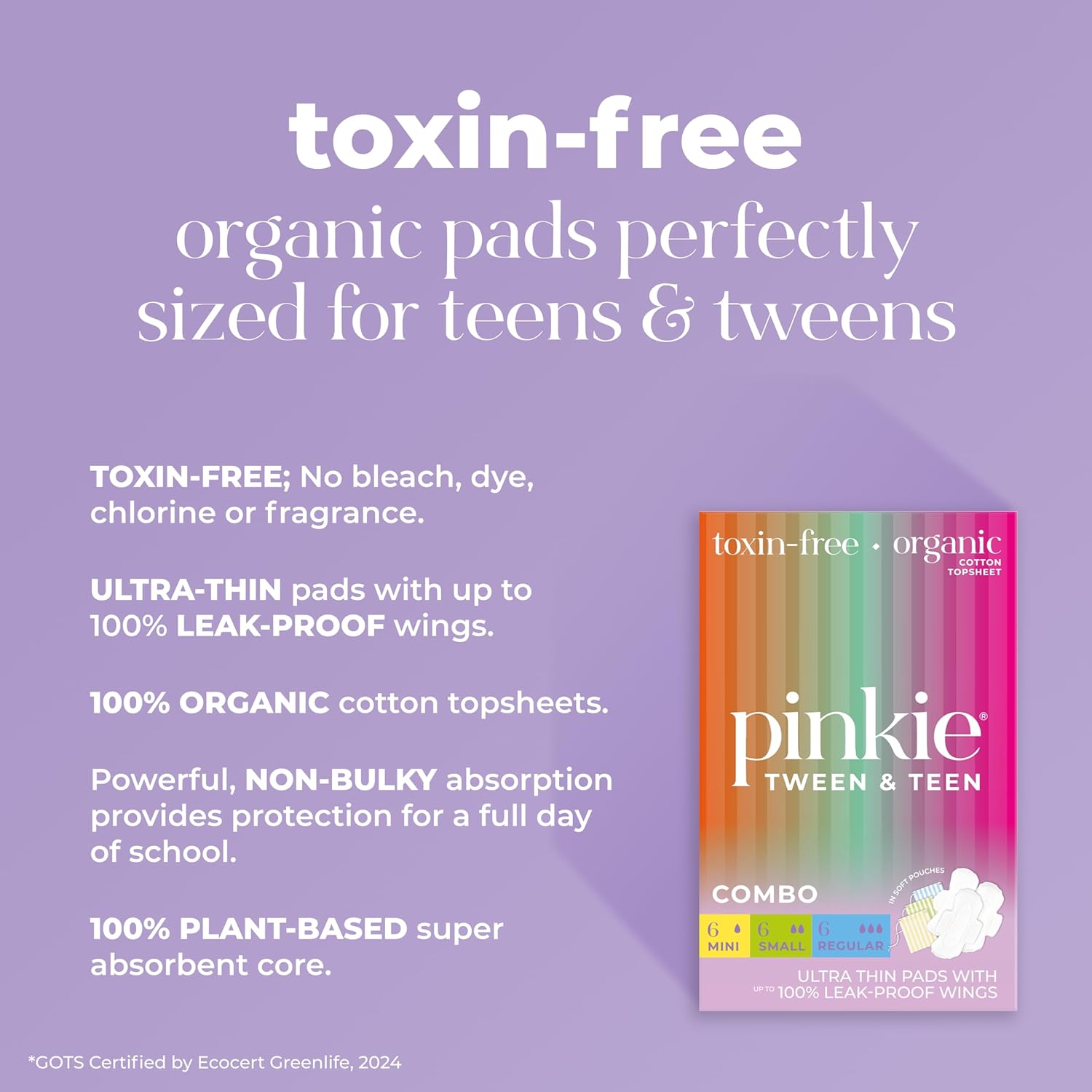 Pinkie Period Starter Pads – Designed for Smaller Underwear – Organic Cotton Topsheet Tween & Teen Pads with Wings – Chlorine Free & Fragrance Free – Teen Combo Pack, 18 Count