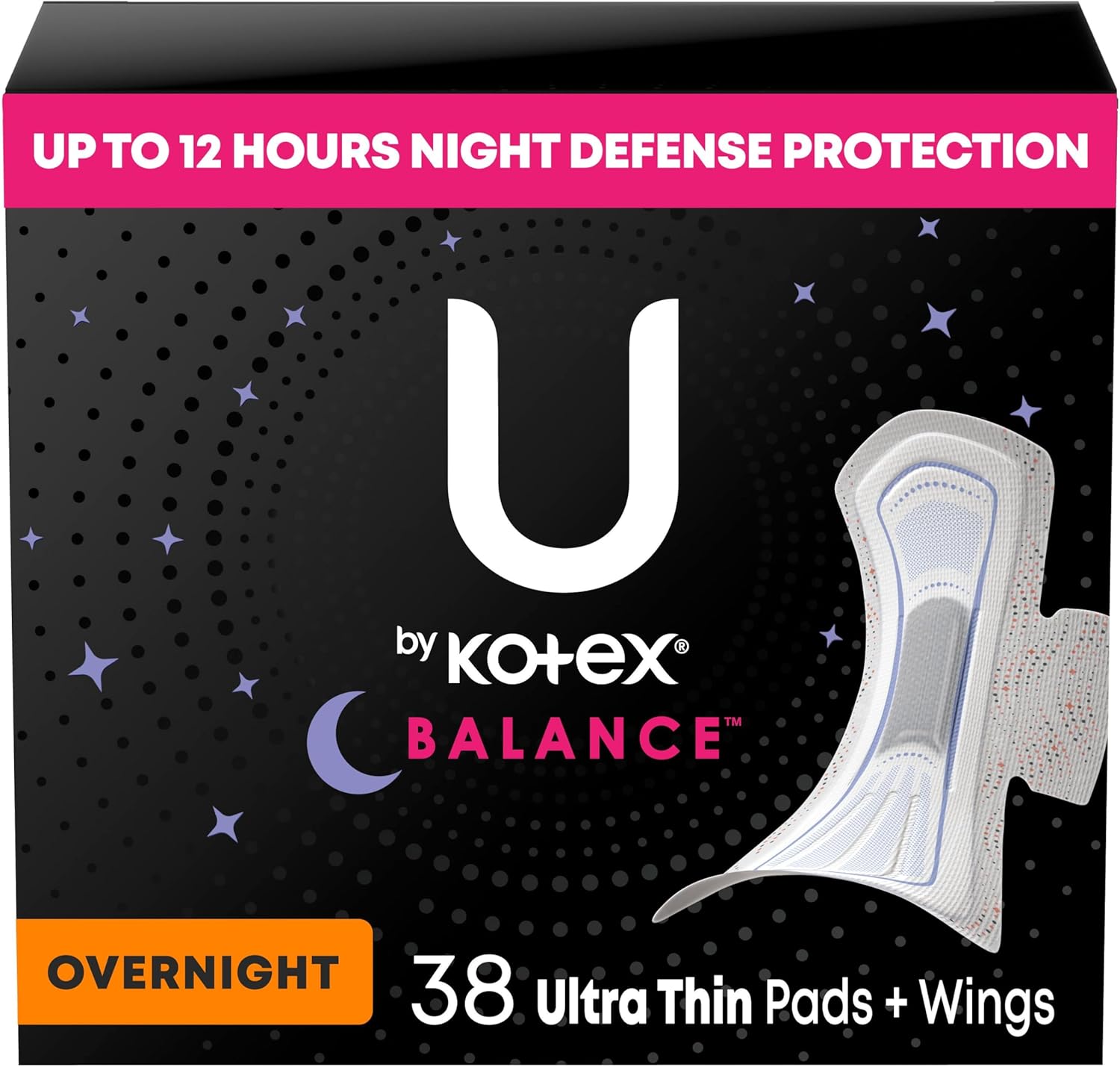 U by Kotex Balance Pads with Wings, Ultra Thin, Overnight, Extra Heavy Absorbency, 30 Count (Packaging May Vary)