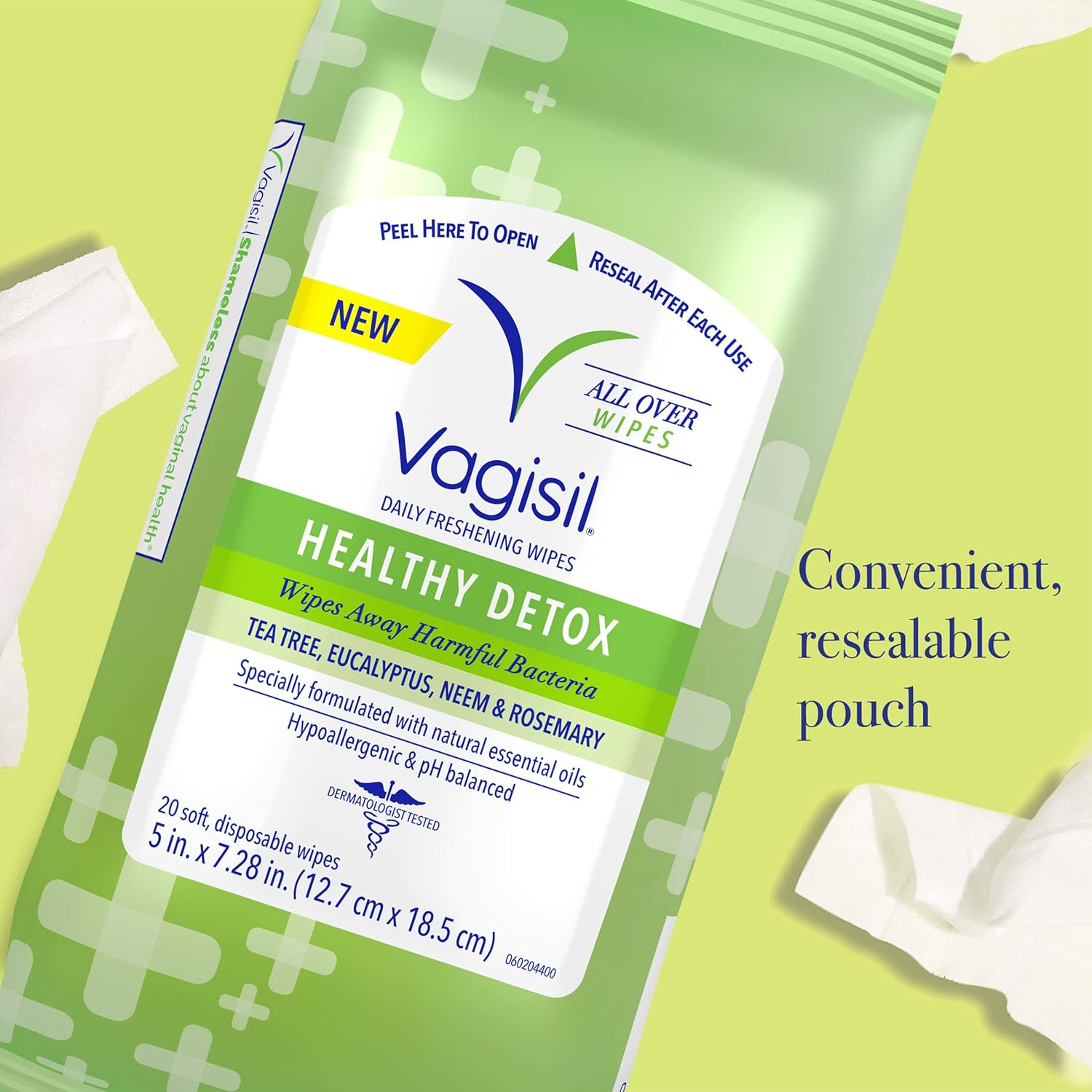 Vagisil Wipes for All Over Cleaning, Health Detox, Formulated with Essential Oils, 20 Wipes in a Re-Sealable Pouch (Pack of 3)